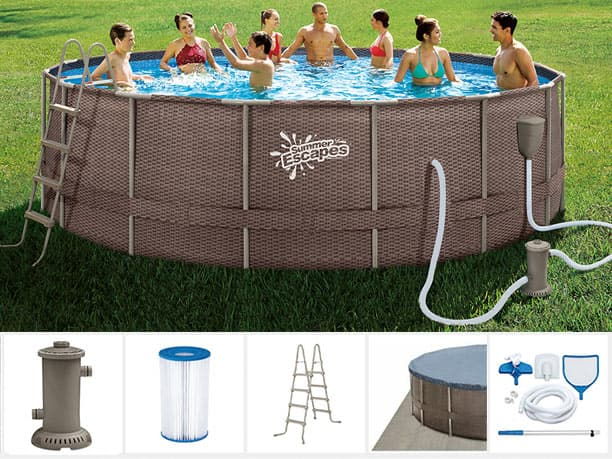 Практичный сборный каркасный бассейн Summer Waves Р20-1652-B Polygroup, обладает оригинальной конструкцией, которая позволяет собрать бассейн за 45-60 минут, без особых физических усилий. Стенки бассейна изготовлены из высококачественного трехслойного ПВХ. Стойки каркаса металлические с покрытием. Бассейн поставляется с полным набором, достаточным для использования, кроме средств для обеззораживания воды.