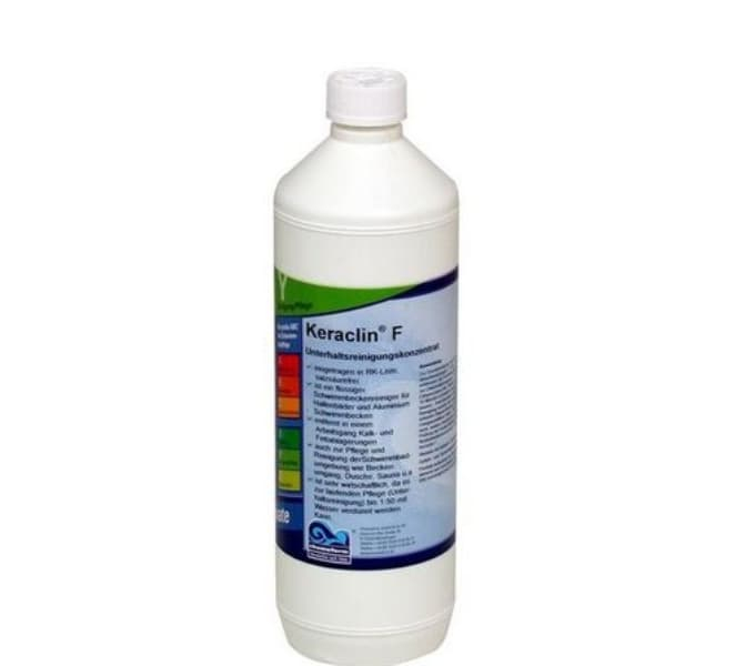 Кераклин F предназначен для удаления небольших жирных загрязнений, известковых налетов и минеральных отложений. Безвреден для покрытий из ПВХ, хлоркаучука и синтетических смол. В составе фосфорная кислота. Можно использовать для очистки душа и сауны.