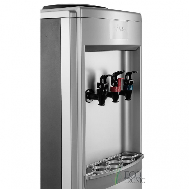 Кулер Ecotronic C9-L Silver имеет антивандальный корпус. Передние панели изготовлены из пластика с добавлением матового полиэстра, благодаря чему поверхность имеет бархатистую структуру. У кулера Ecotronic C9-L Silver есть 3 краника подачи воды с защитой от случайного нажатия и подсветкой кранов подачи воды. Модель комплектуется системой защиты от протечек воды.