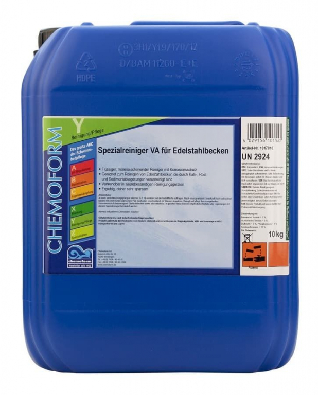 Средство Chemoform ВА предназначен специально для очищения предметов из нержавейки, уходом за ними, а также за хромированными изделиями и другими металлическими предметеми. Средство ВА удаляет налет ржавчины и минеральные загрязнения, предохраняет нержавеющие металлы от неблагоприятных условий окружающей среды, придает блеск. В составе фосфорная кислота.